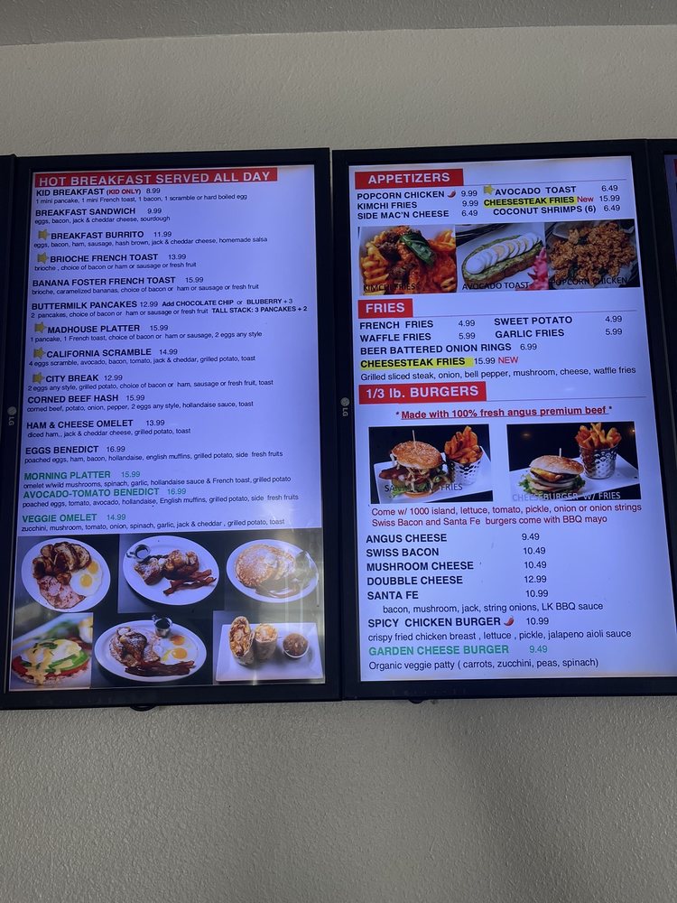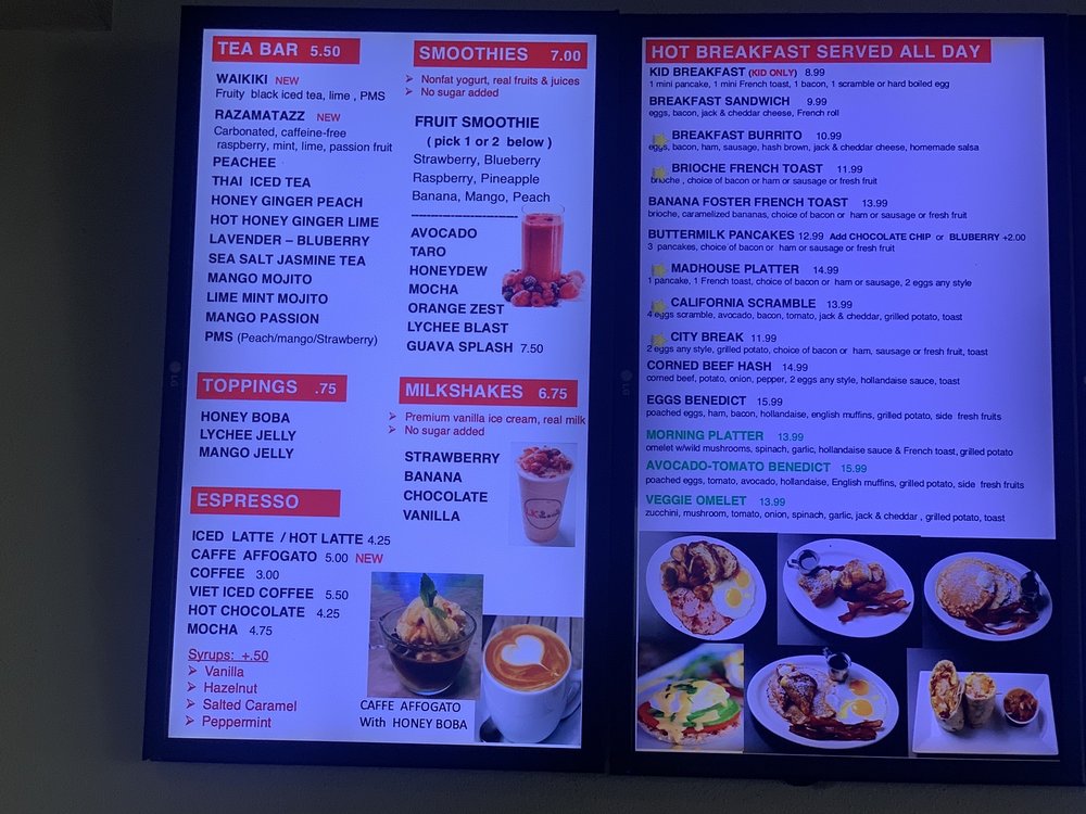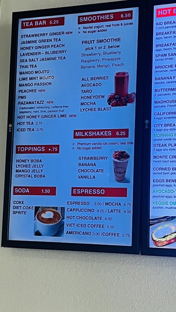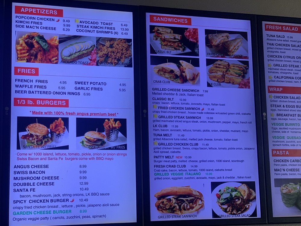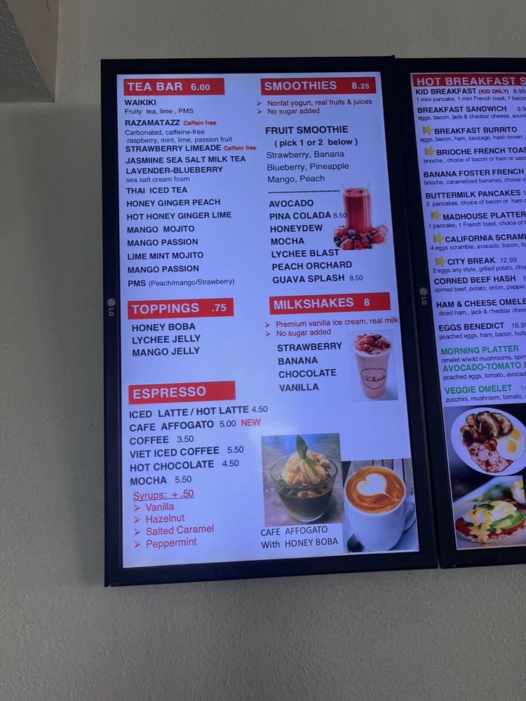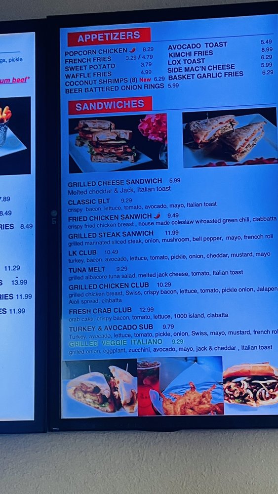 Introducing the menu at Lk Tea & Grill, a go-to spot in San Jose for Coffee & Tea, Juice Bars & Smoothies, and American cuisine. With a range of options like Popcorn Chicken, French Fries, Avocado Toast, and the popular Breakfast Burrito, this place caters well to diverse tastes. The bakery section offers tempting treats like Snicker Doodle and Chocolate Chip Cookies. Customers rave about the delicious French Toast with crispy bacon and flavorful Steak Kimchi Fries. The spacious and friendly atmosphere, combined with quality food and reasonable prices, make Lk Tea & Grill a standout choice for breakfast or brunch. Don't miss out on their unique offerings and delightful flavors when you visit this restaurant!