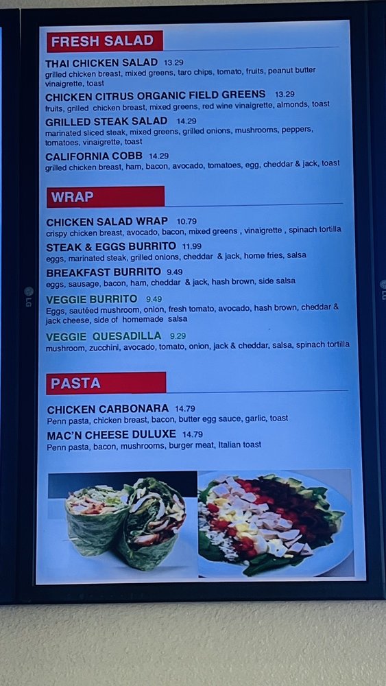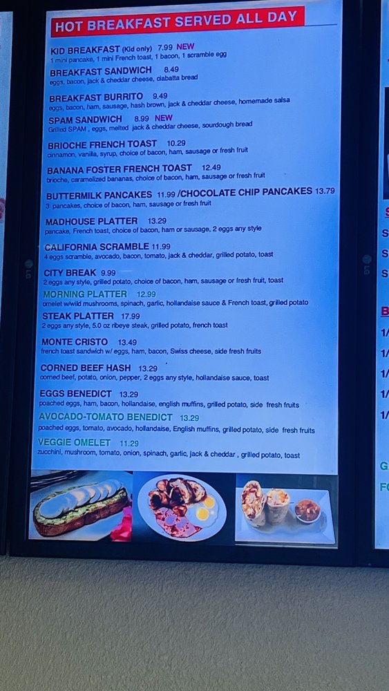 Eggs, bacon, sausage, ham, hashbrown, cheddar and jack cheese, and spicy homemade salsa. One of our most selling item in the menu.